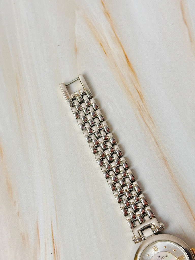 Elegant Anne Klein ladies wristwatch featuring a refined silver-tone case and bracelet with a beautiful mother-of-pearl dial. The dial is accented with subtle gold-tone markers and Roman numerals, giving it a classic and feminine look.