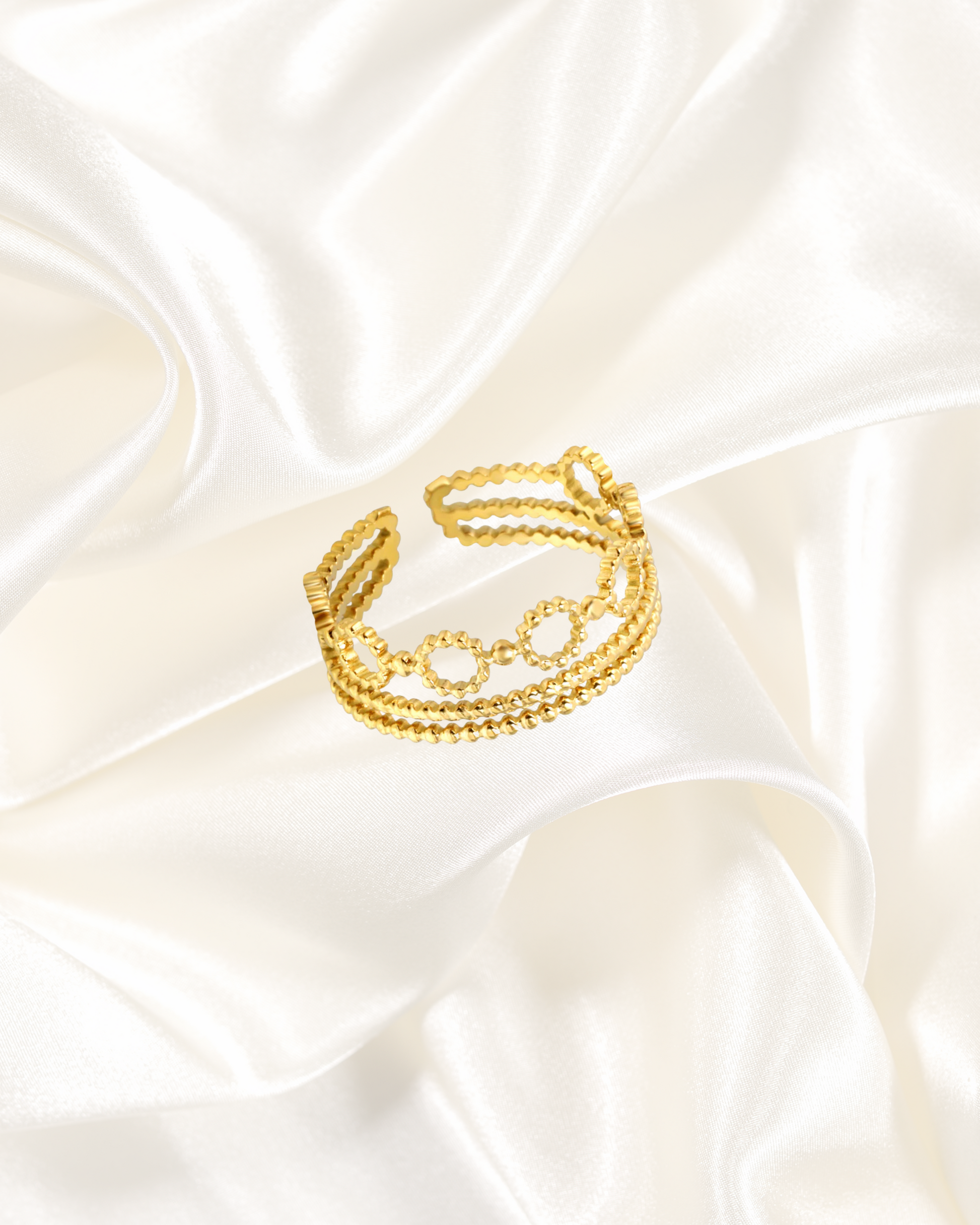Delicate yet striking, this ring features multiple beaded bands woven together in an intricate openwork design. Crafted in radiant 18K gold plating, it combines texture and dimension for a look that is both feminine and modern. Perfect as a standalone statement or stacked with simpler bands, it adds a refined touch to any jewelry collection.