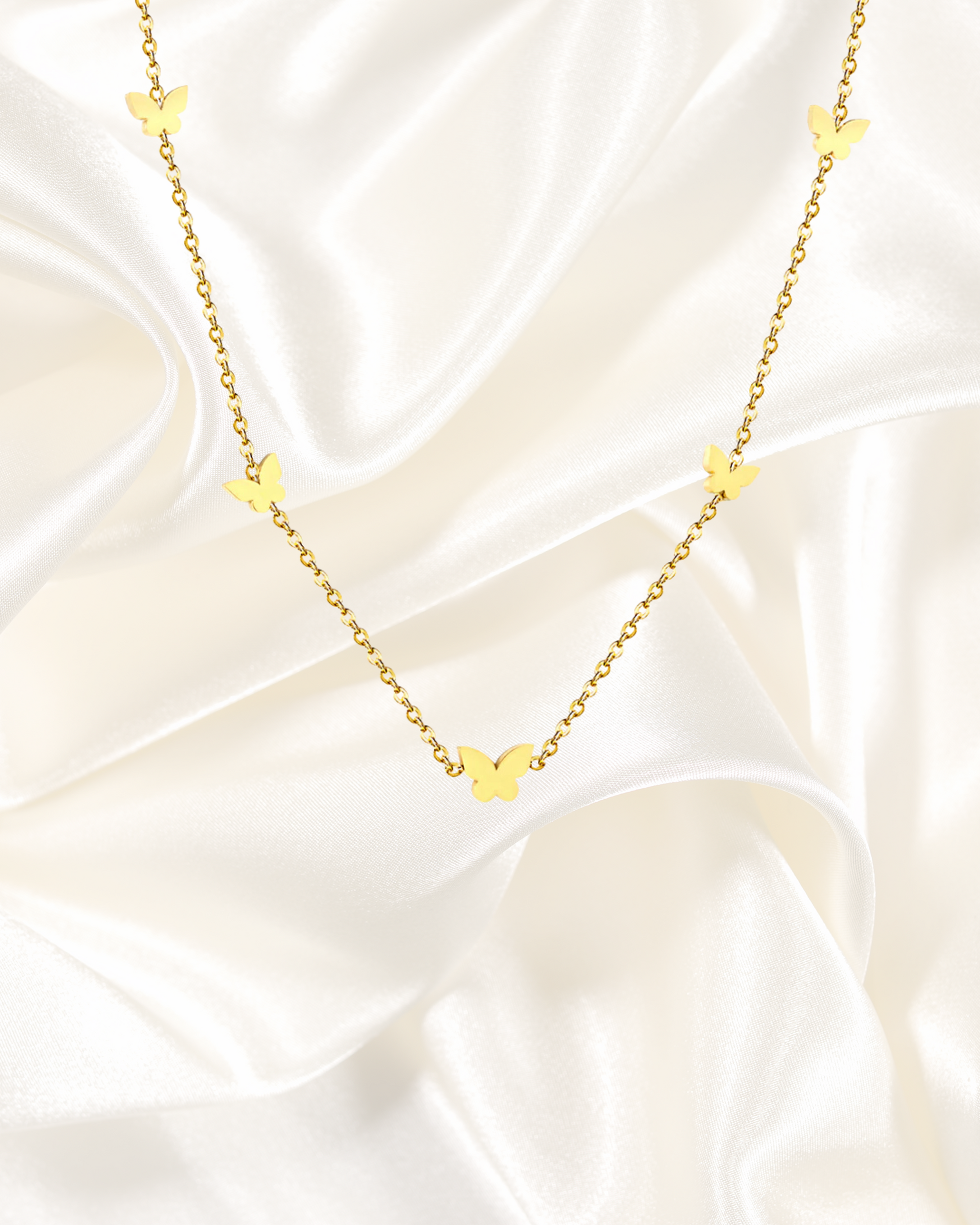 Delicate and whimsical, this necklace is crafted in radiant 18K gold plating and adorned with multiple butterfly charms along a fine chain. A symbol of transformation and elegance, the butterflies add a touch of playfulness while maintaining a refined style. Perfect for layering or wearing as a subtle statement piece.