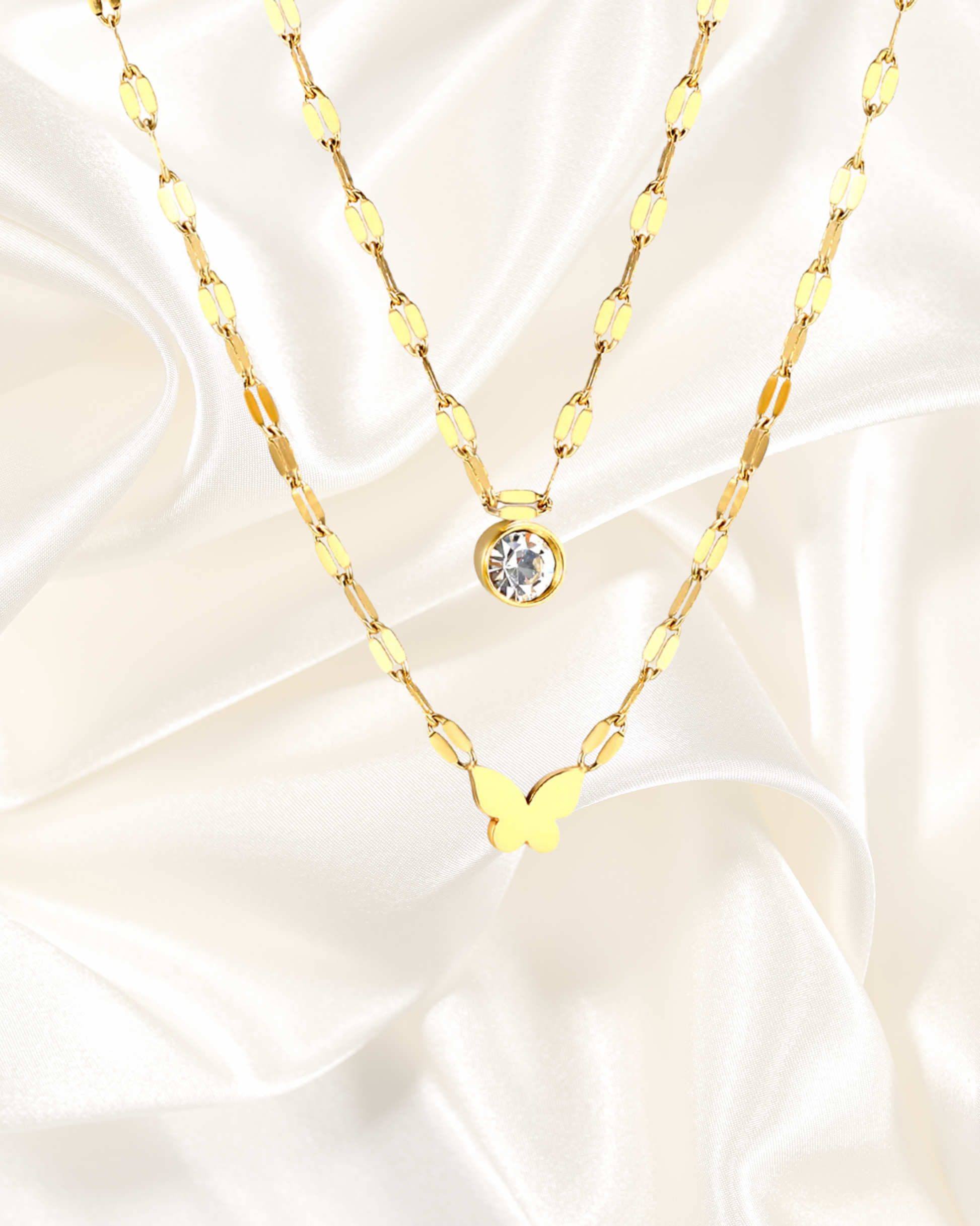 Delicate and feminine, this layered necklace is crafted in radiant 18K gold plating with two fine chains. One features a sparkling bezel-set crystal, while the other is adorned with a polished butterfly charm. The elegant design adds a playful yet refined touch, making it perfect for layering or wearing solo as a statement of grace and beauty.
