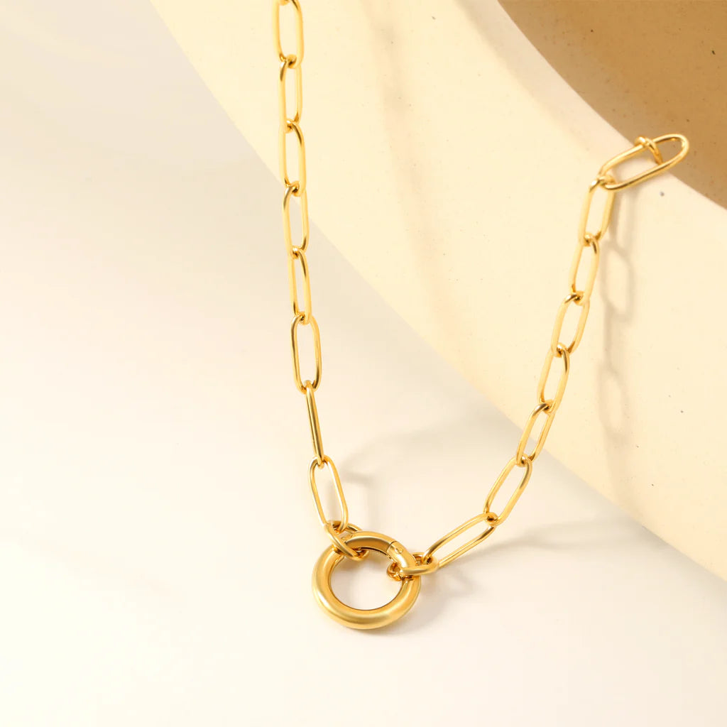 Modern and versatile, this necklace is crafted in luminous 18K gold plating and features an elongated chain with a bold circular pendant at its center. The minimalist design blends timeless elegance with contemporary edge, making it perfect for layering or as a standalone statement piece.