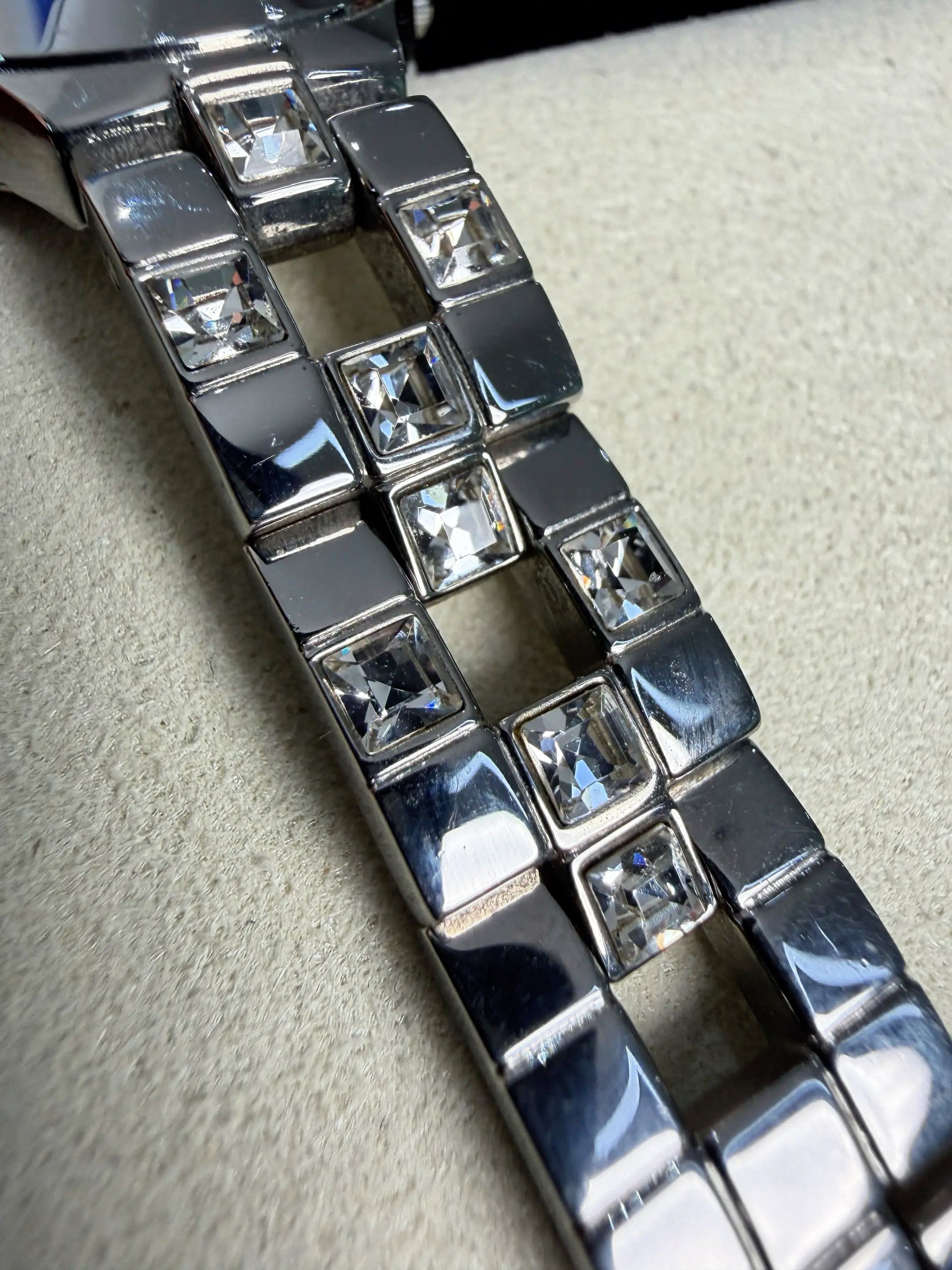 Bracelet: Matching silver-tone stainless steel multi-link, fits ~6″ wrist