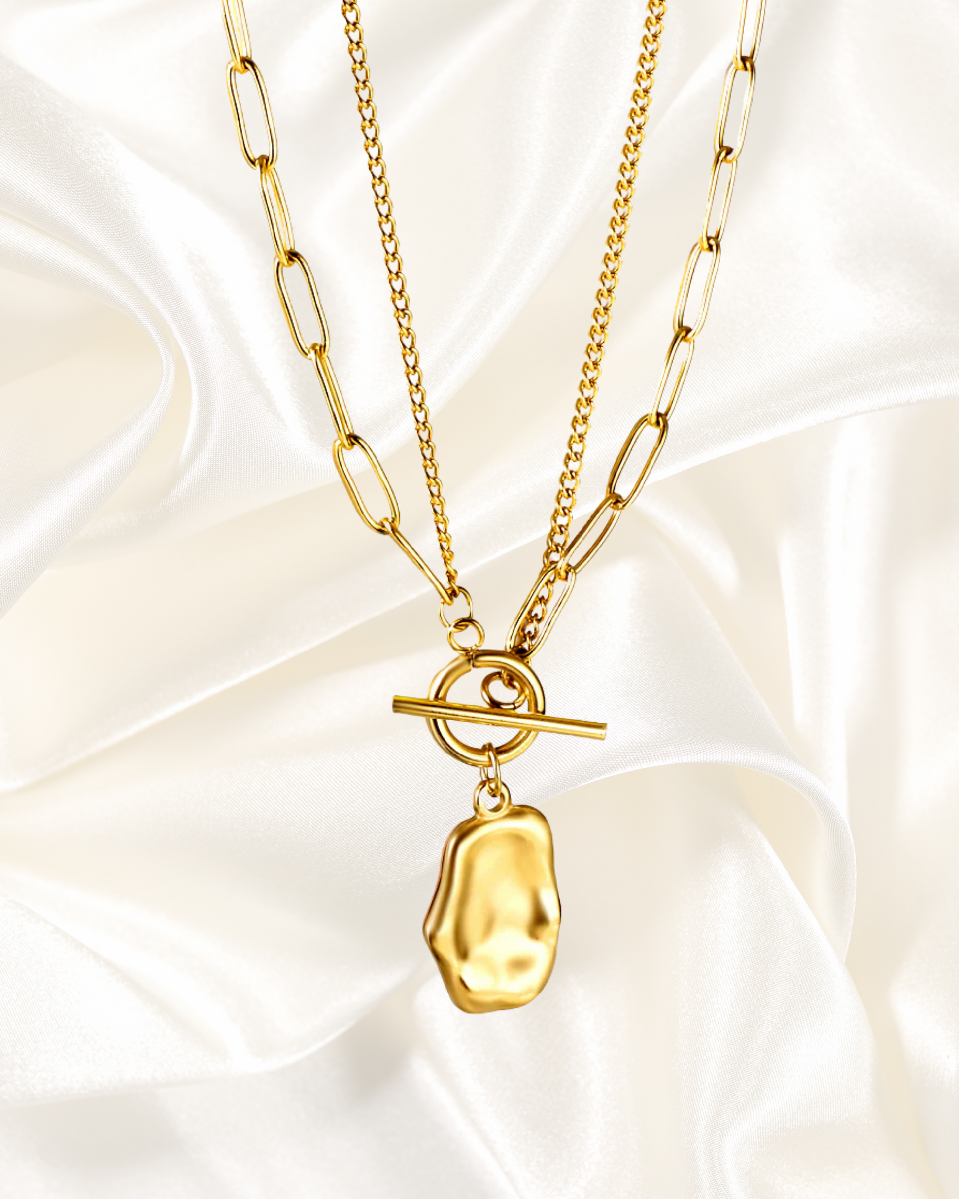 An artistic expression of modern jewelry, this necklace features an abstract nugget-shaped pendant suspended from a chic toggle clasp. Crafted in luminous 18K gold plating, it combines a bold oval link chain with a sleek curb chain for a layered effect. Its fluid, organic form makes it a standout accessory that adds effortless sophistication to both casual and dressy looks.