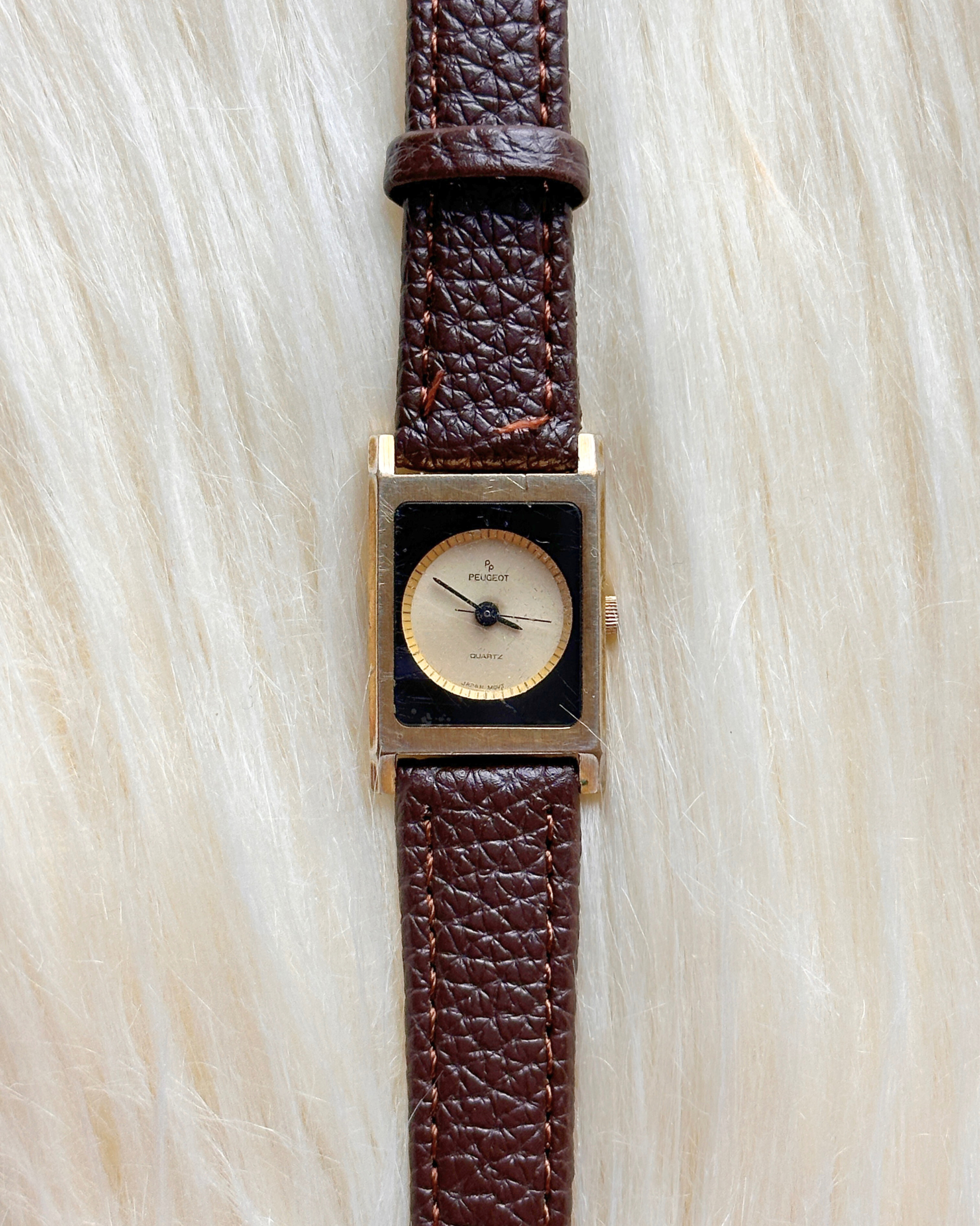 Classic Peugeot wristwatch featuring a rectangular gold-tone case with a contrasting black inner frame and a cream dial.