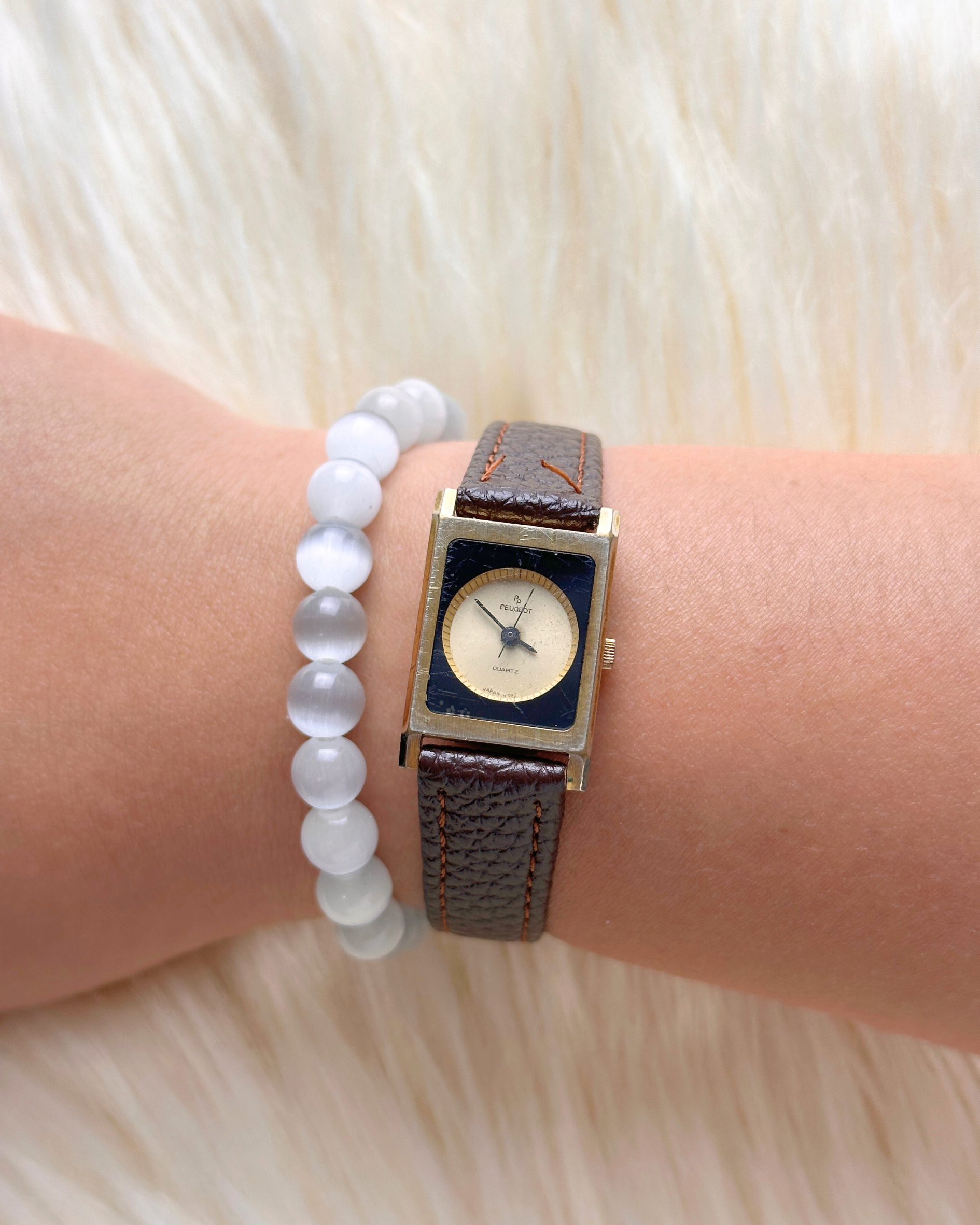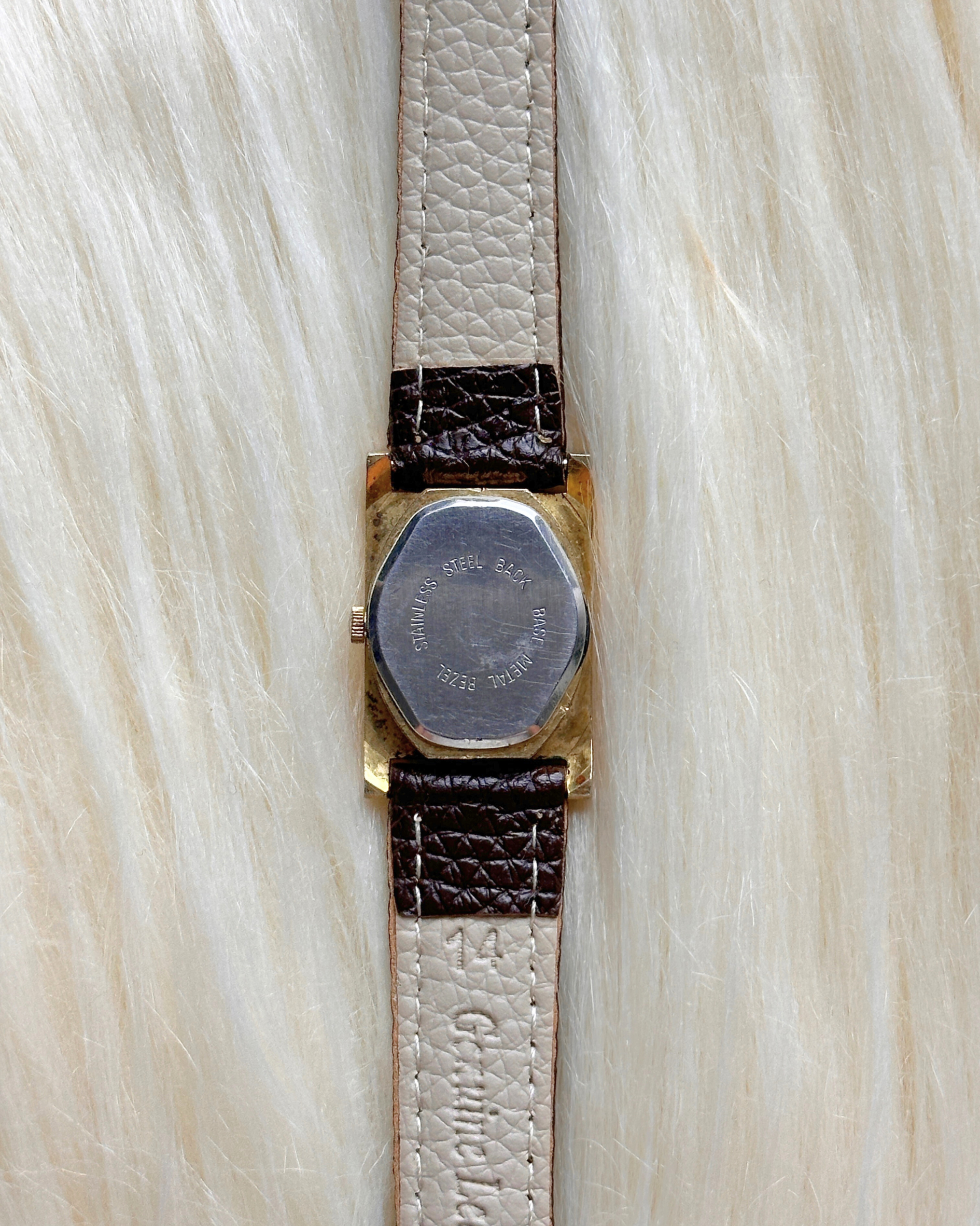 Peugeot Quartz Watch – Gold Tone Rectangular Case, Brown Leather Strap