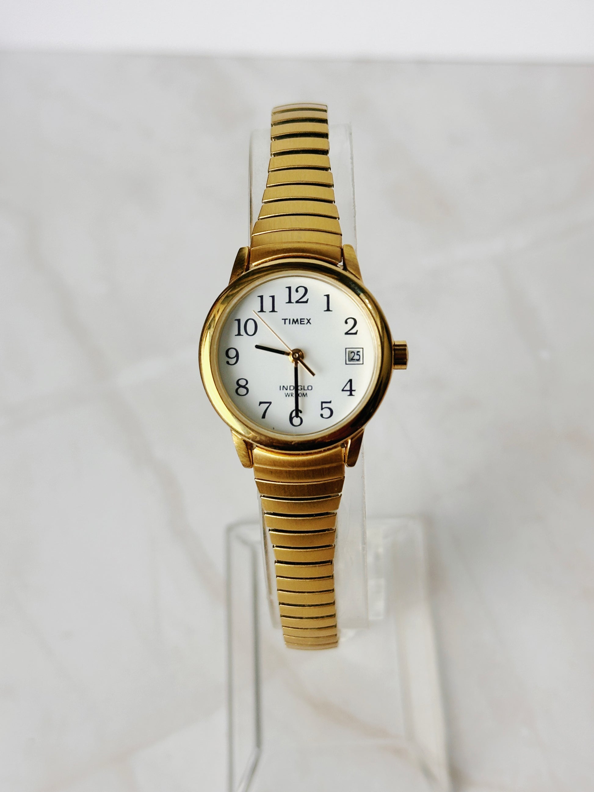 Powered by reliable Timex quartz movement and equipped with Indiglo backlight functionality, this watch is both practical and timeless in style. The gold-tone stretch bracelet ensures a comfortable fit and easy wear without a clasp.