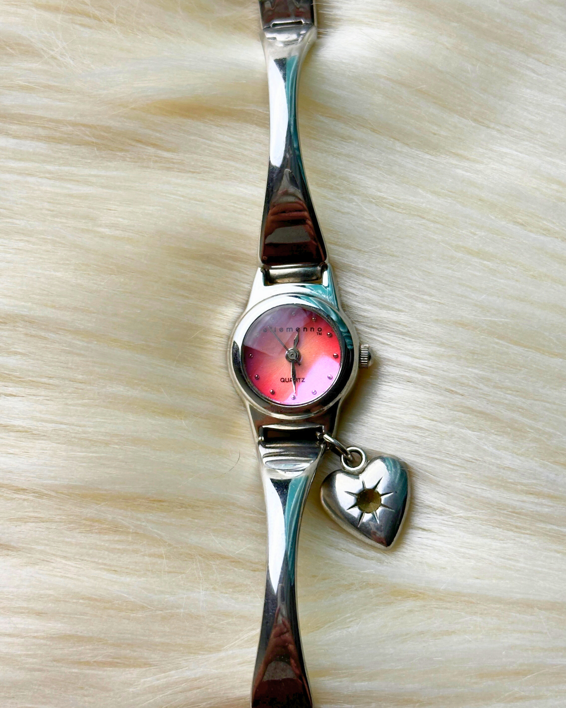 A charming and feminine vintage Ellemenno ladies’ quartz watch featuring a sleek silver-tone bracelet and a unique pink gradient dial that shifts beautifully in the light. The minimalist face keeps the design clean, while the heart-shaped charm adds a playful, decorative touch. A lovely piece for anyone who enjoys delicate, expressive vintage accessories.
