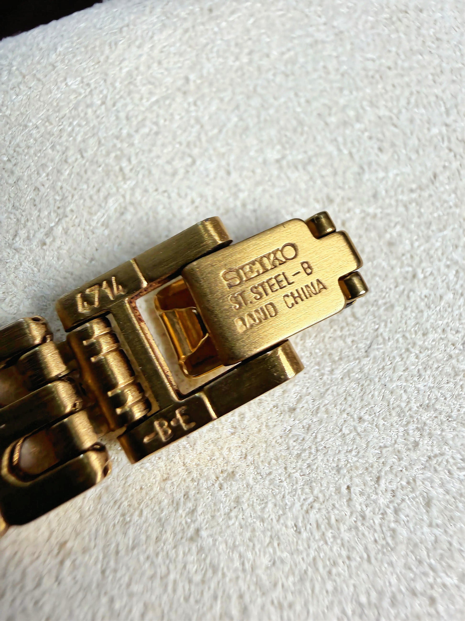 A refined piece of vintage Seiko craftsmanship, the 1N00-1E09 is an elegant ladies’ quartz dress watch with a stainless-steel case and bracelet plated in polished gold tone. Its 20 mm round case houses a clean white dial with slim baton hour markers and minimalist two-hand analog display. Compact and graceful, it’s perfect for both daily wear and formal occasions.