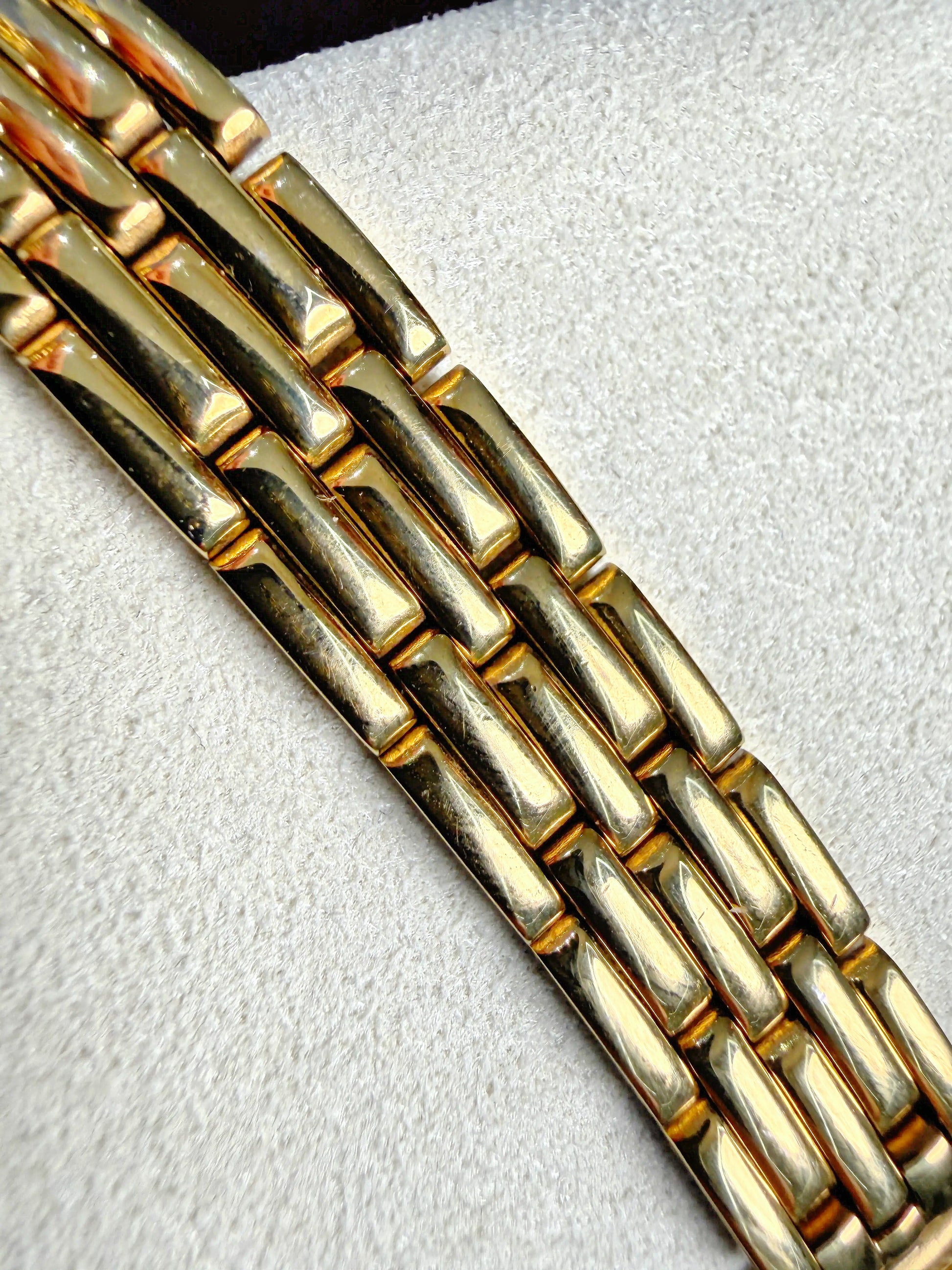 Bracelet: Matching gold-tone multi-link, fits ~6" wrist